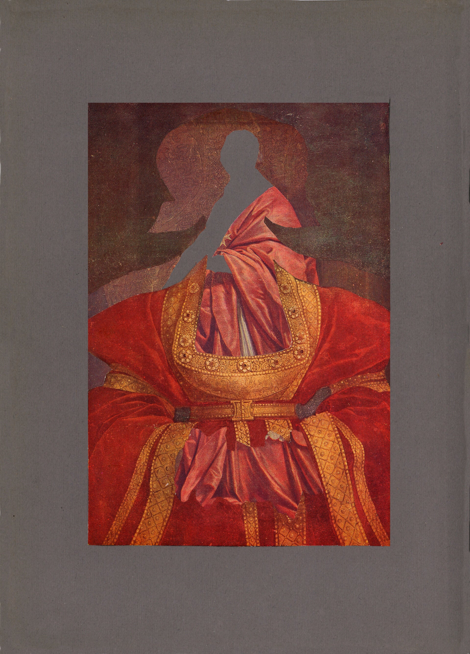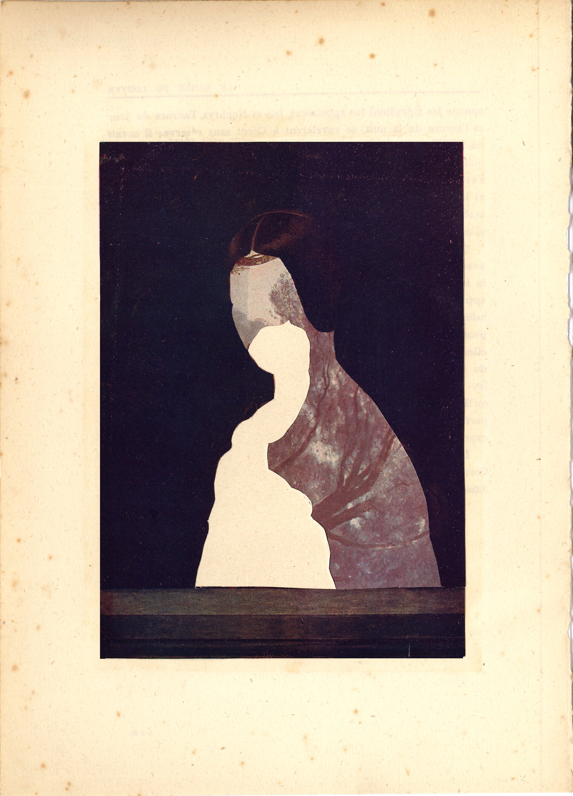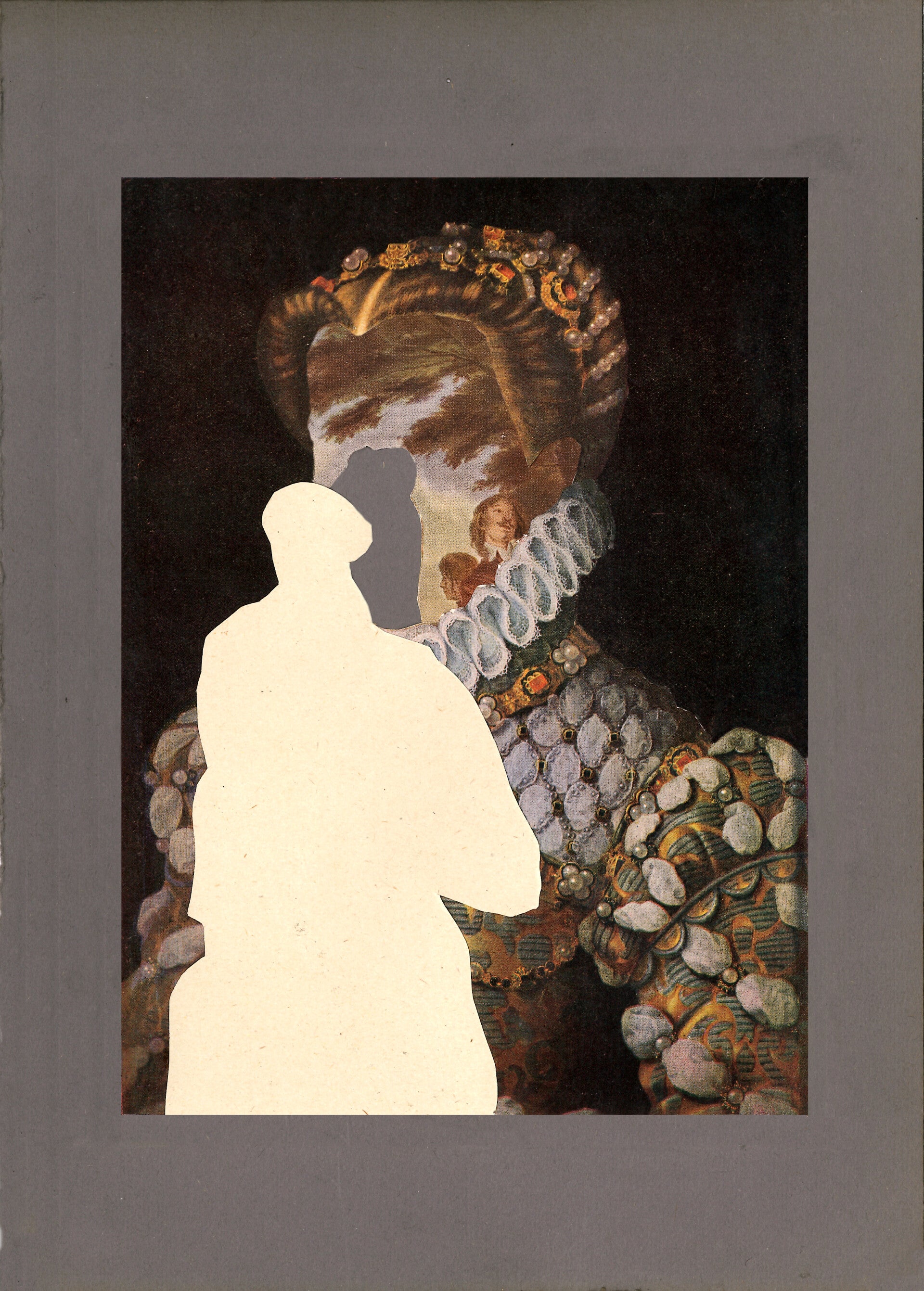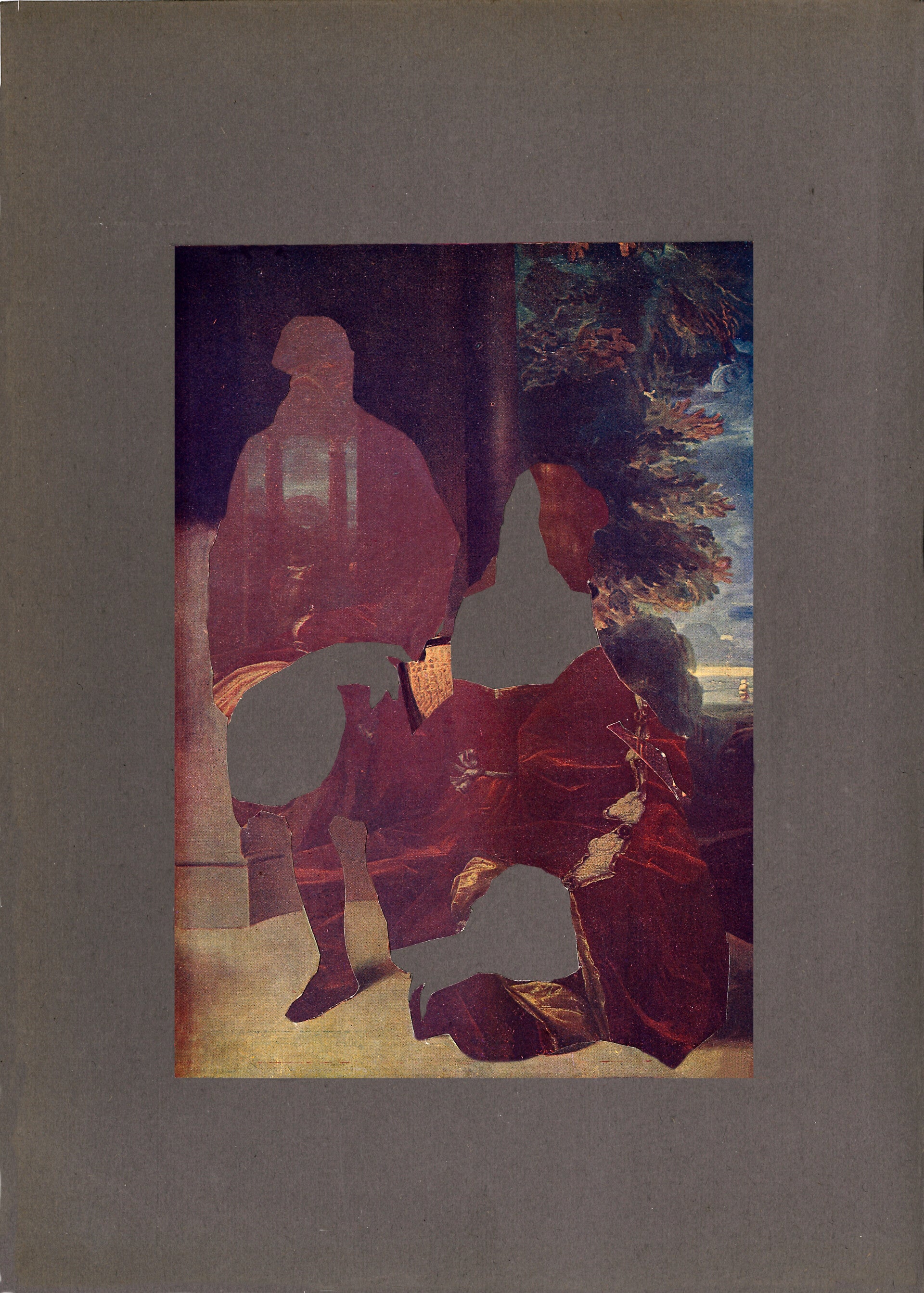 Au décès de ma mère, j'ai revisité deux albums regroupant les chefs-d'oeuvres du Louvre et du Prado. Ces deux ouvrages hérités de son père étaient mon entrée dans le monde des représentations picturales de l'occident. Ces deux volumes ont toujours été là, dans leur mystère et photogravure aux couleurs approximatives et plutôt sombres. Ces images avec lesquelles j'ai toujours vécu, je les ai découpées, enlevé les feuilles, extrayant leur sujet et mélangeant le tout. Sorte de rituel pour leur donner une nouvelle vie.